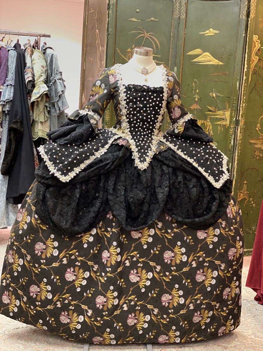 Роскошный исторический костюм, стиль 18 -го века, ручной работы от драгоценной ткани Rubelli и обогащенный кружевом, отделками и жемчужиной.