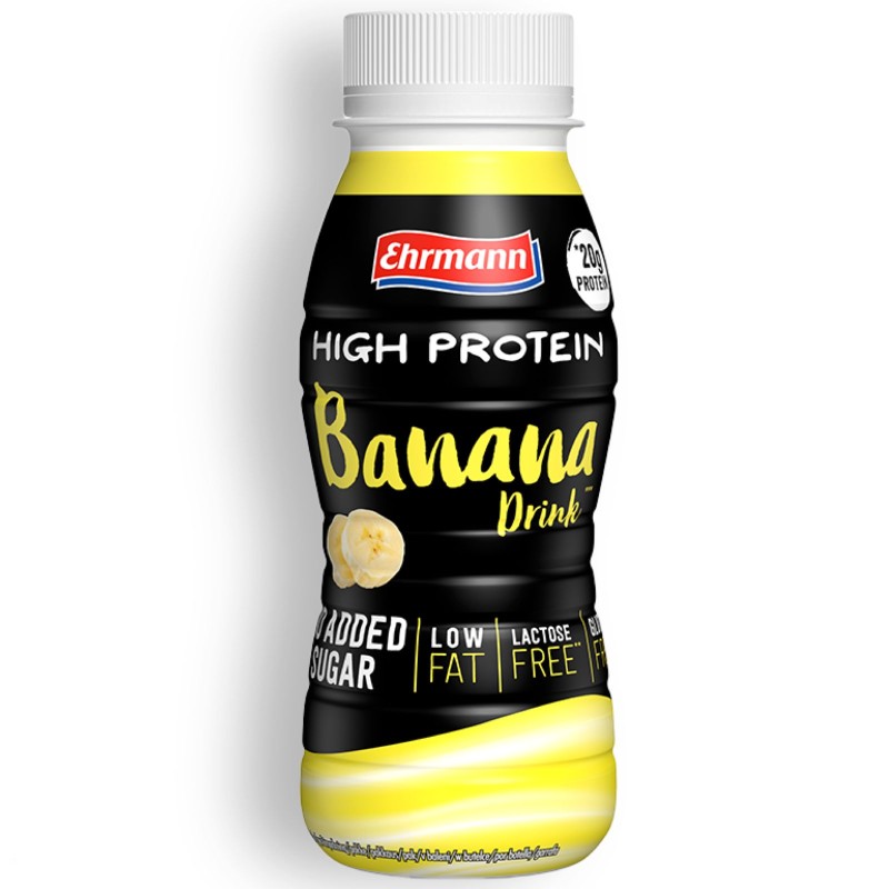 Высокий белок от Ehrmann -это идеальная закуска, готовая к выпивке, сенсационный коктейль с молочным коктейлом без лактозы и глютенового банана!