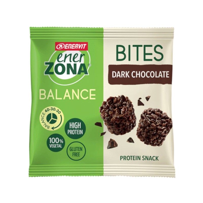 Enerzona кусает темный шоколад -это закуска без глютена, подходящая для вегетарианцев и веганов, богатых белками и волокнами.