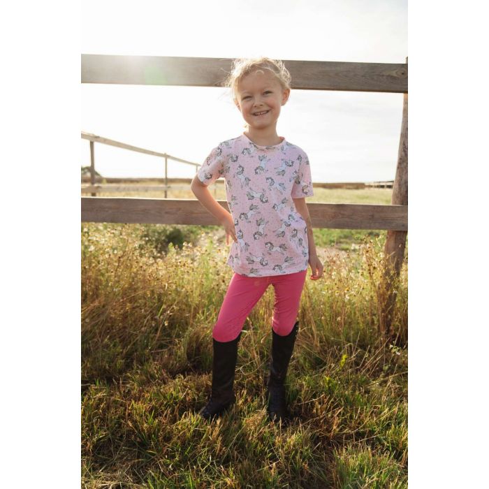 Веселая детская футболка из летней коллекции EquiPage. Рубашка имеет короткие рукава, круглый вырез и милый принт единорога по всей поверхности.