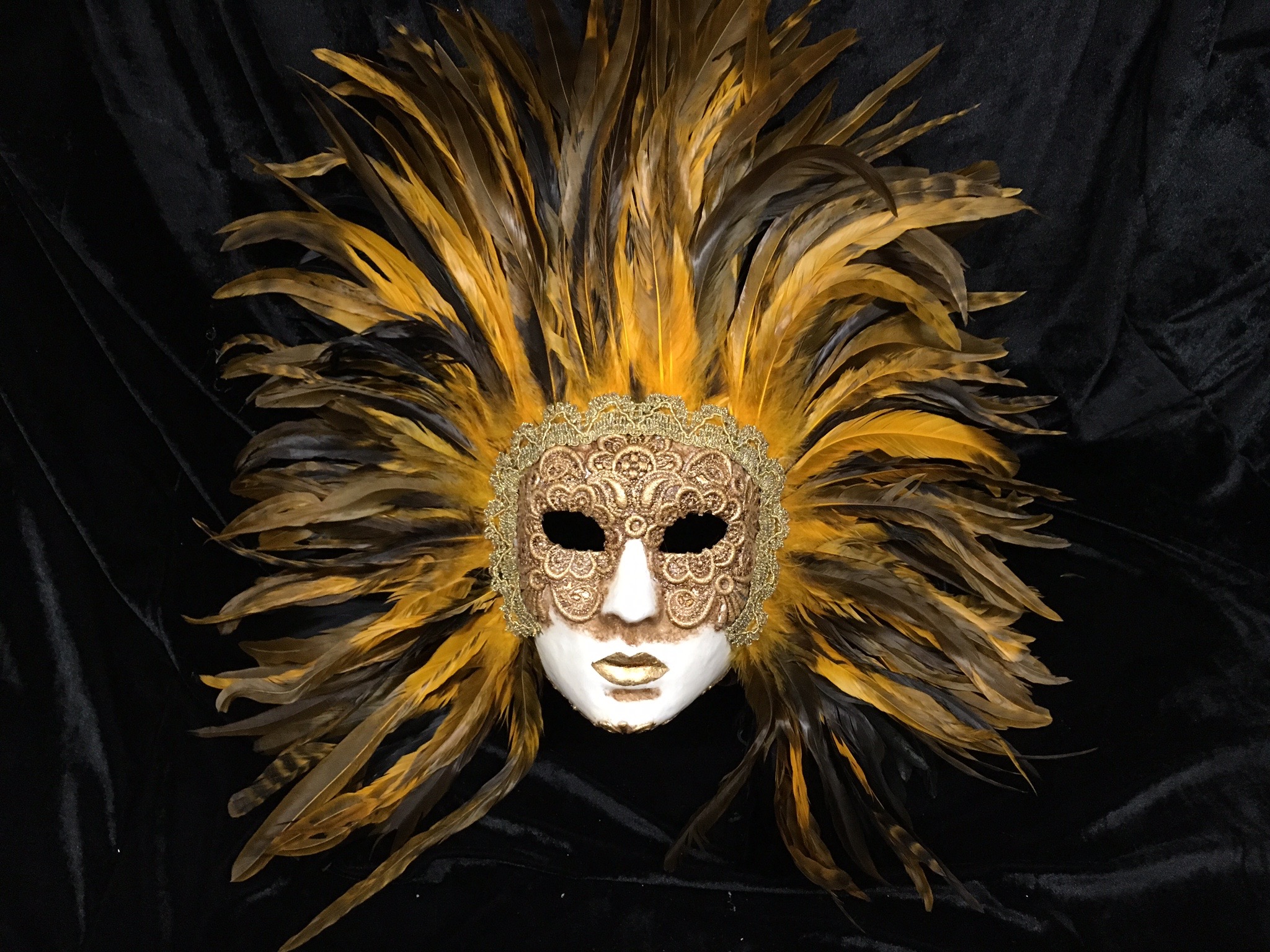 Маска ручной работы в бумажной маше, украшенная кружевом, перьями из золотых листьев и Сваровски Кристал.