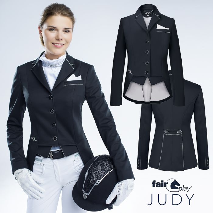 Короткая выездковая куртка из высококачественной тонкой, эластичной и водостойкой ткани софтшелл. Декорирован элегантной металлической окантовкой. Сзади декоративная съемная планка. В комплект входит бандана-бутоньерка и два сменных клапана: бежевый и черный с серебряной отделкой. Вентиляционные отверстия под подмышками обеспечивают надлежащий поток воздуха.