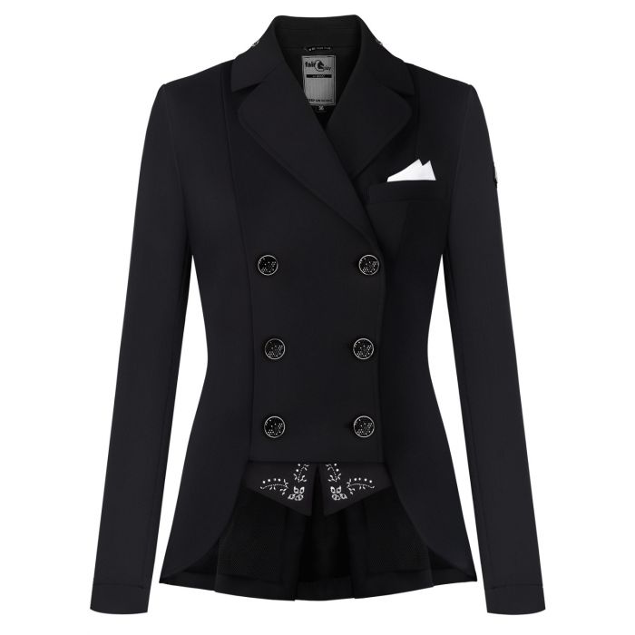 Элегантный короткий фрак идеального кроя. Куртка для соревнований имеет двойной ряд пуговиц и потайную молнию для обеспечения надежной посадки. Изготовлен из дышащего и эластичного материала COMFINAT-tech™ для максимального комфорта. Сетчатая подкладка и петелька под мышкой обеспечивают хорошую вентиляцию. Куртка отделана декоративной вышивкой на воротнике и спине, а также атласным карманом.