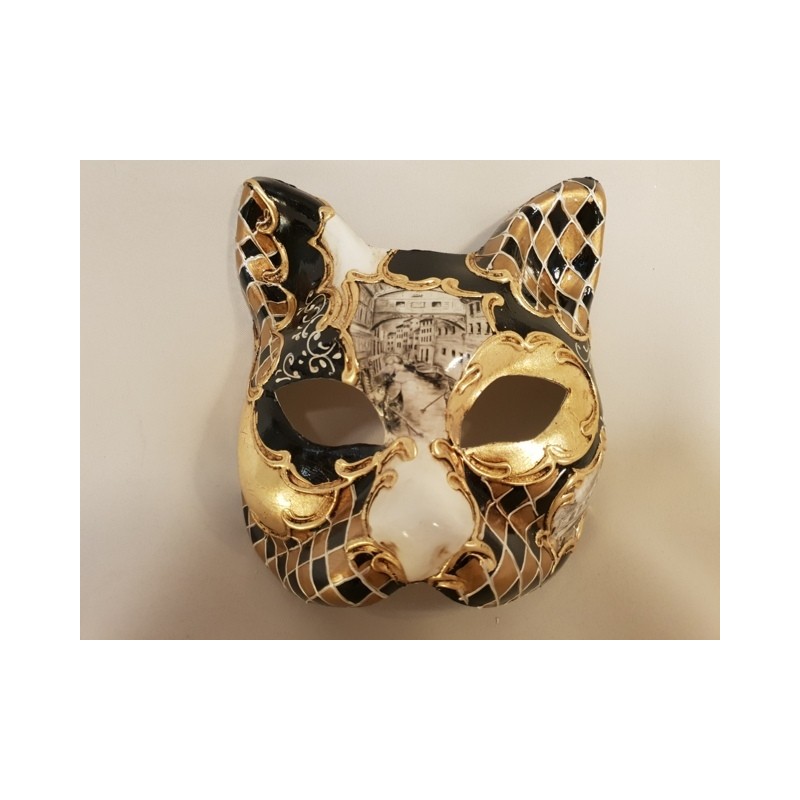 Маска в форме кошки с лентами представляет на поверхности некоторые чертежи пейзажей Венеции.