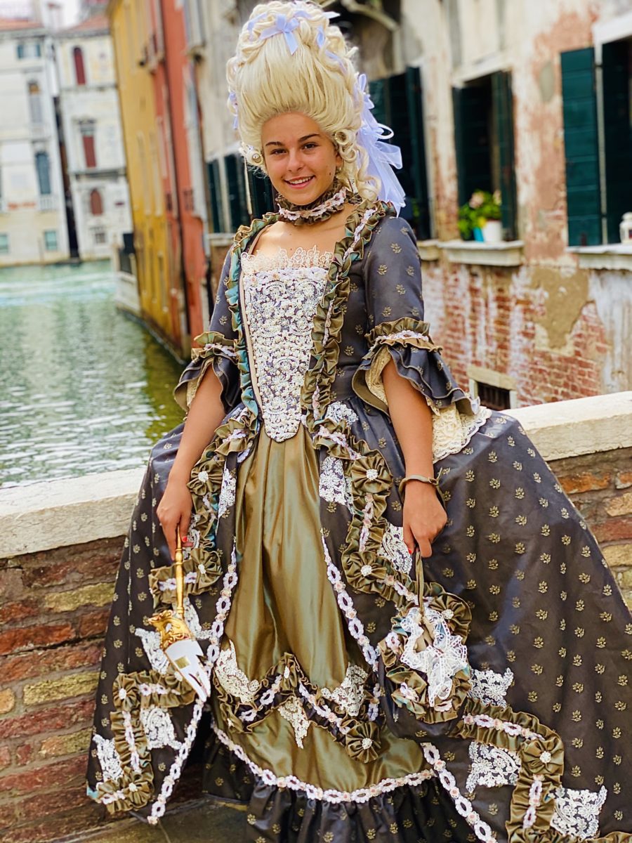 Handmade reproduction of historical dress from 18th century. Damasque fabric.