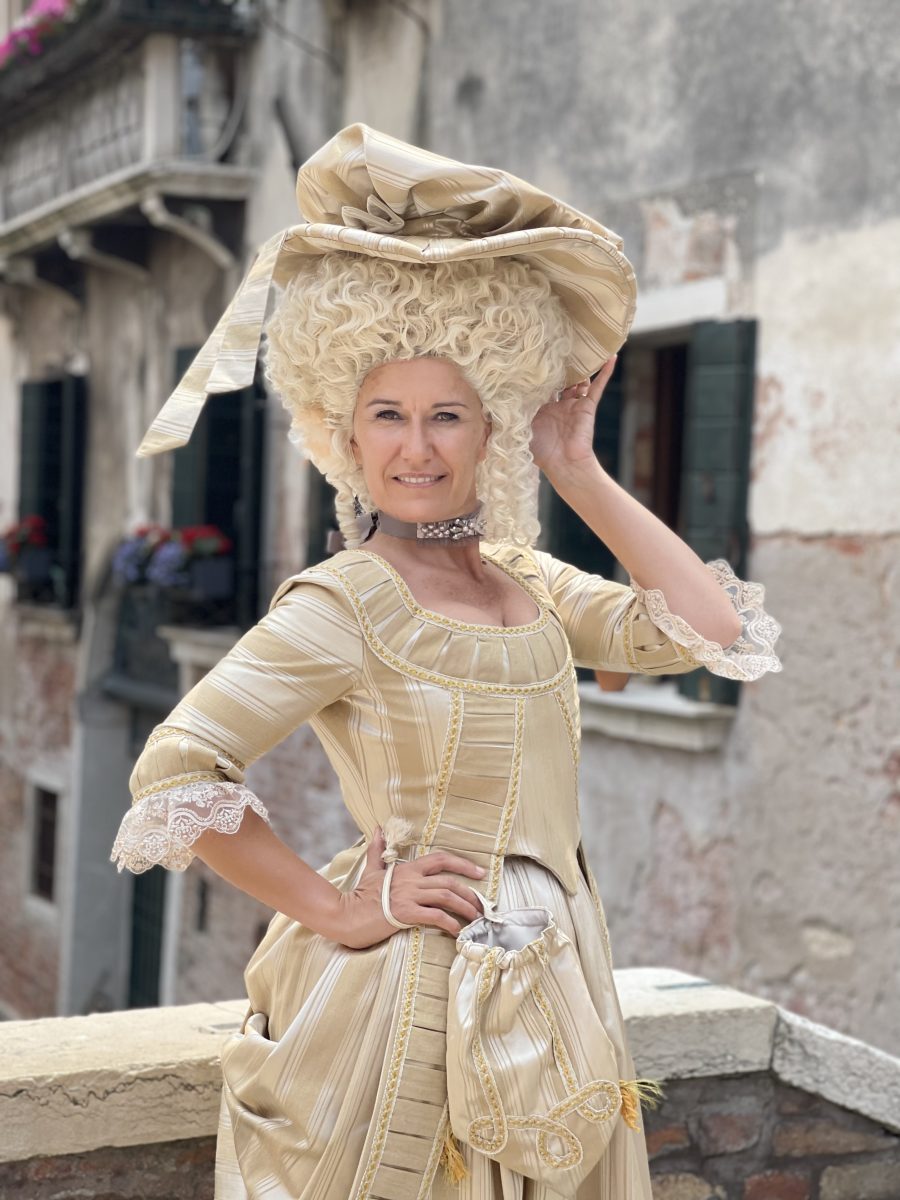 Handmade reproduction of historical dress from 18th century. Moiree striped fabric.