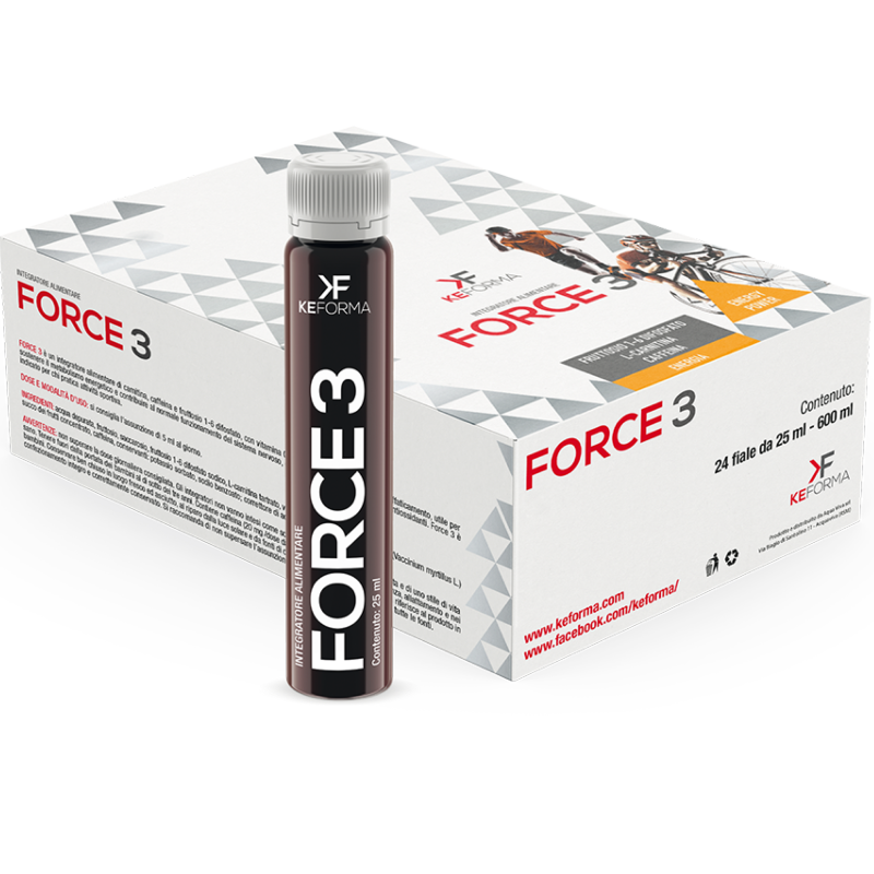 Force 3 представляет собой пищевую добавку карнитина, кофеина и фруктозы 1-6 Difosfate, причем витамин С указывается в случае усталости и усталости, полезной для поддержки энергетического метаболизма и способствует нормальному функционированию нервной системы и черникой, известной своей свойствами. антиоксиданты.