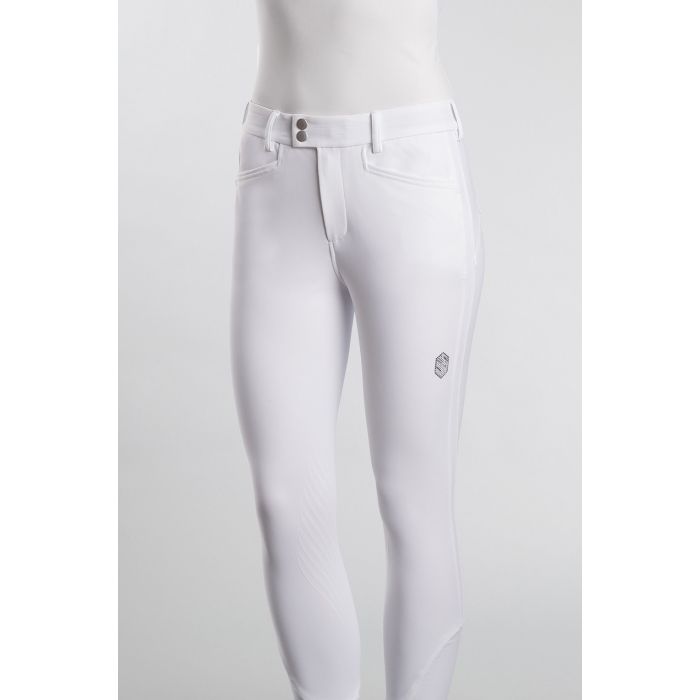Бриджи Hortense созданы для того, чтобы обеспечить гонщикам комфорт и технические характеристики. Бриджи Hortense, изготовленные из износостойкой эластичной ткани, создают эффект второй кожи, обеспечивая превосходную посадку и оптимальный комфорт. Индивидуальный дизайн и эластичная ткань обеспечивают воздухопроницаемость и защиту от ветра. Силиконовый наколенник обеспечивает устойчивость и комфорт в седле. Компрессионная ткань обеспечивает идеальную посадку бриджей. Эластичная лента внутри пояса оснащена силиконом, который не дает рубашке подниматься. Благодаря специальному строению ткани бриджи Hortense обеспечивают защиту от ультрафиолетовых лучей. Бриджи украшены гербом Swarovski® Samshield на бедре и кристаллической тканью Swarovski® на задних карманах, сочетая технические характеристики и элегантность.