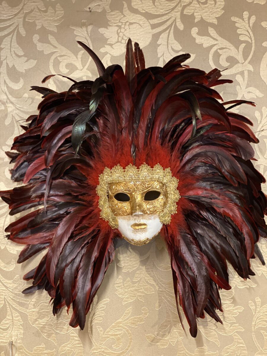 Маска Paper Maché, полностью изготовленная вручную и украшенную вручную перьями, акриловыми цветами и золотом/серебряным листом.